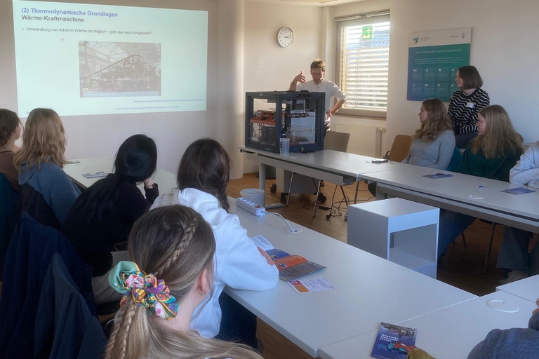 Dank des engagierten Teams der Forschungsgruppe Nachhaltige Gebäudeenergietechnik, allen voran Beatrice Rodenbücher und Dr. Andreas Velte, konnten die Teilnehmerinnen und Teilnehmer die Funktionsweise der Wärmepumpe hautnah erleben. Mit einem Demonstrator, ausgestattet mit Schaugläsern sowie Temperatur- und Drucksensoren, wurde ein Hörsaalexperiment zum interaktiven Lernerlebnis: Die Schülerinnen und Schüler beobachteten selbst, wie Wärme effizient übertragen und elektrische Energie genutzt wird, und erlebten damit Theorie unmittelbar in der Praxis.